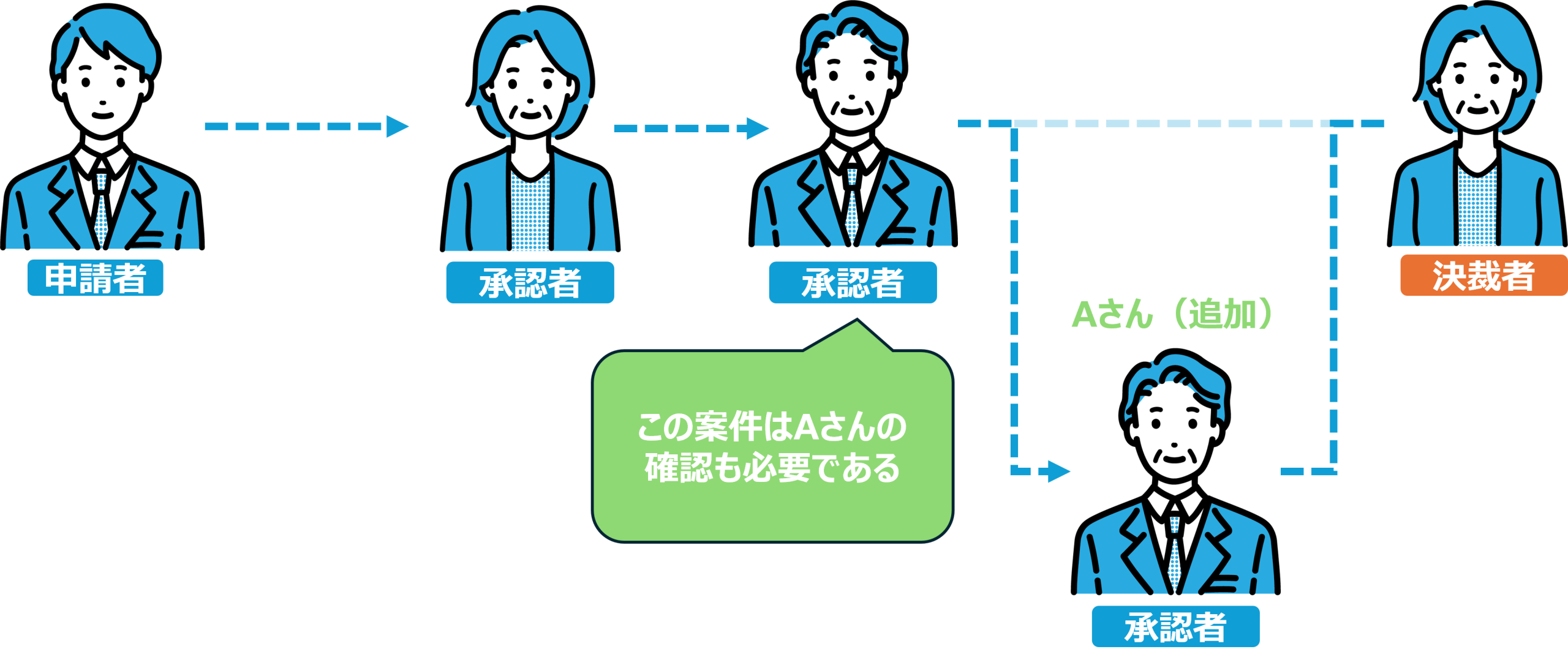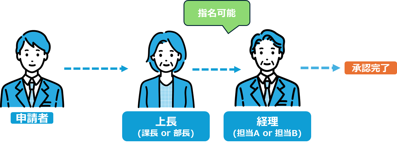 申請者が承認者を個別に指名するタイプ。承認者は特定の役職ではなく、個人単位で指定されることが一般的。