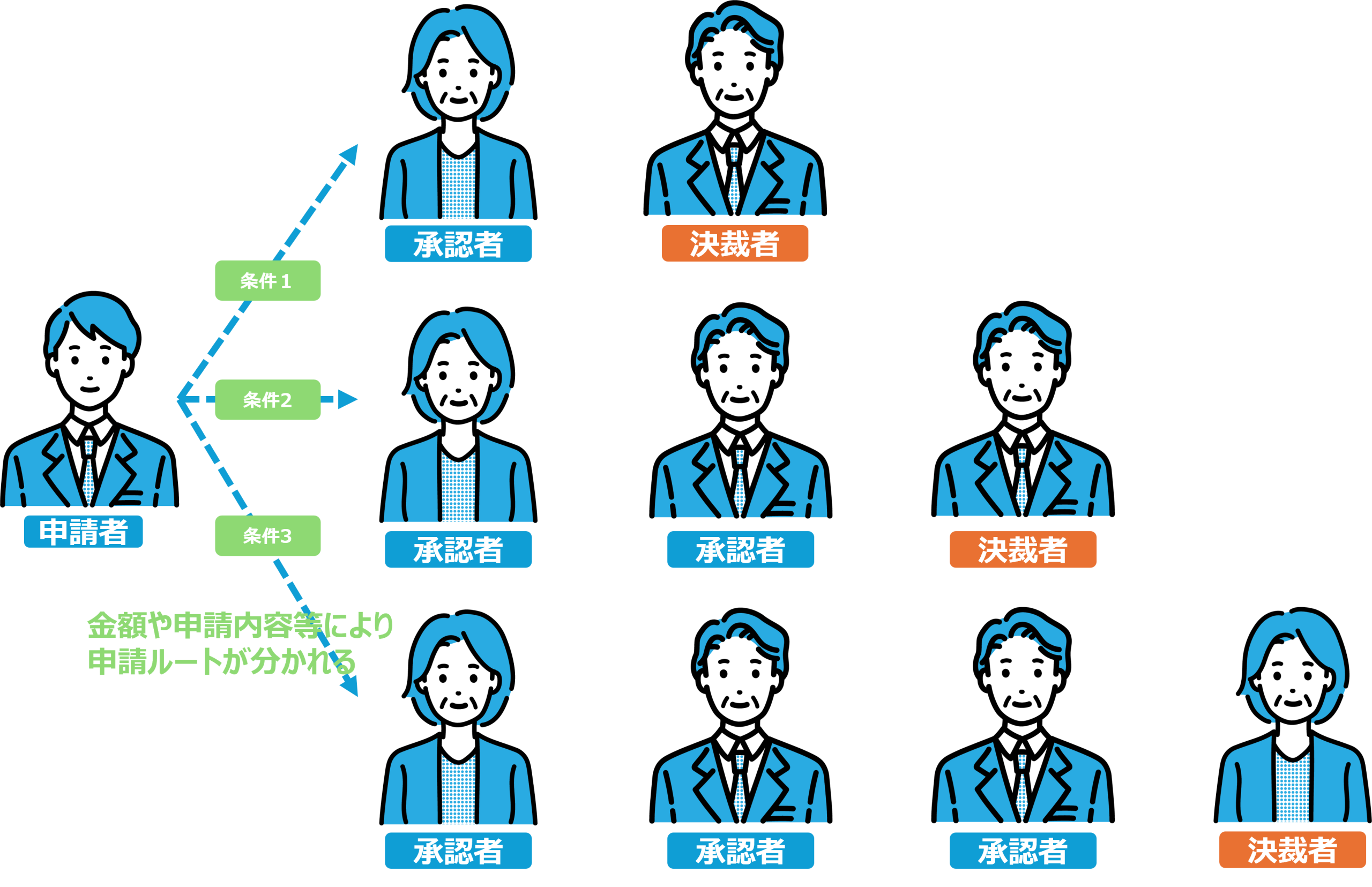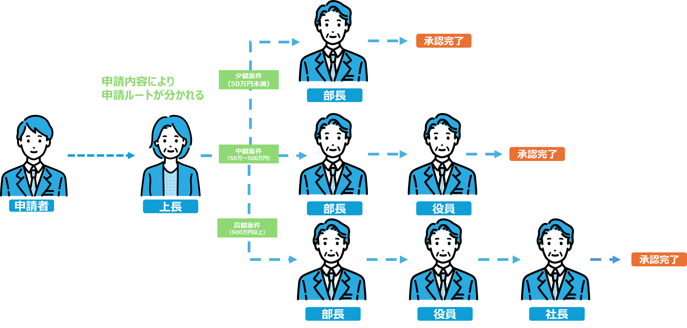 ✅条件分岐型:申請内容により「役員承認が必要」など分岐が発生するケース。