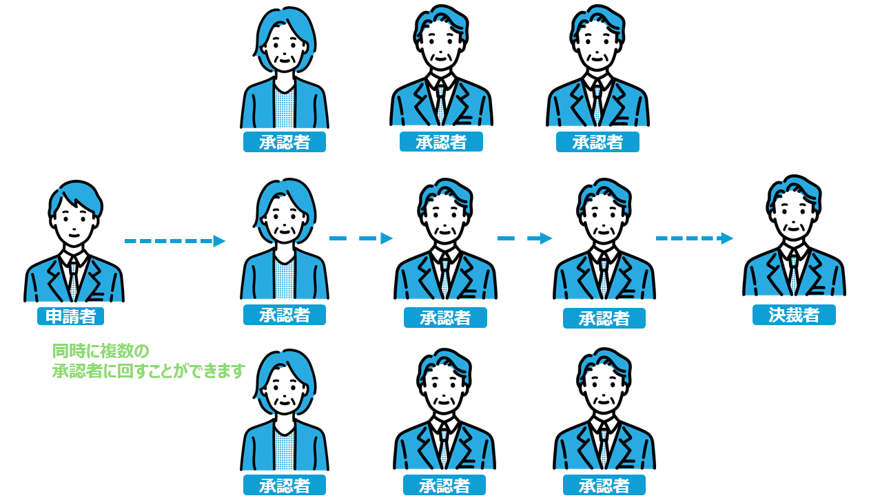 複数の承認者が同時に承認を行うタイプ。例: 申請者 → 部門長、財務部、法務部(同時承認) → 最終決裁者。