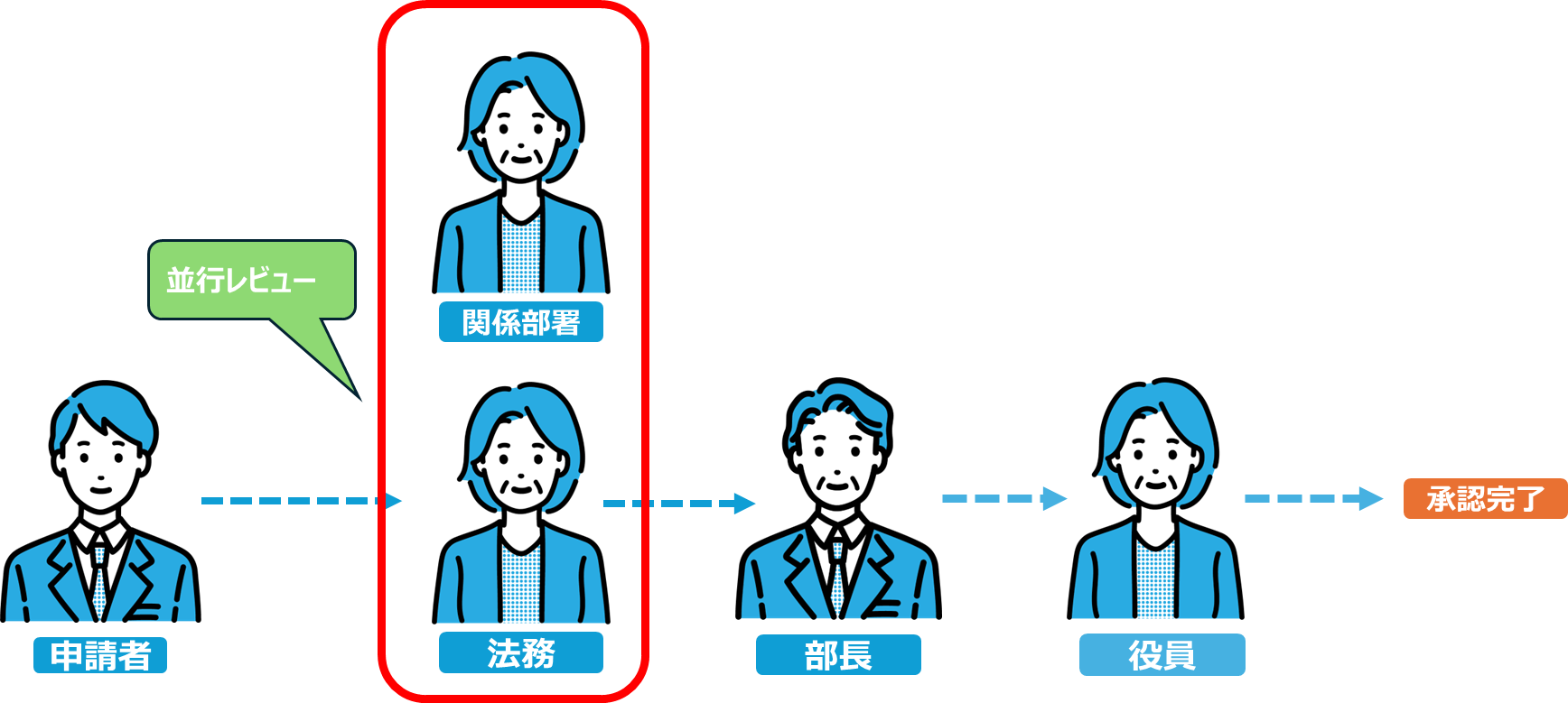 ✅並列型+直線型の混合:法務・関係部門の並列レビュー後に、部長や経営層で直線的に承認。